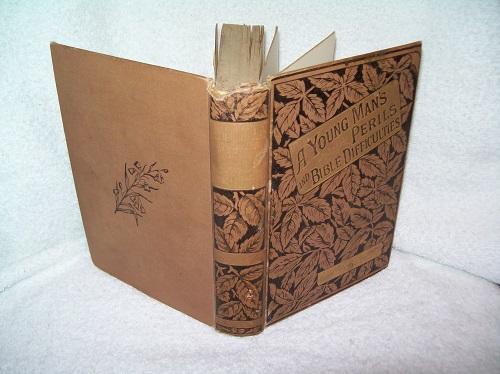 Willard Tract Depository, Toronto, no date, Sixth Edition. Antiquarian book: possible printing approximately 1900. Containing ‘A Young Man’s Safeguard in the Perils of the Age’, by Rev. William Guest, F.G.S. and ‘A Young Man’s Difficulties with His Bible’, by Rev. D. W. Faunce, D.D. Hard cover, 157 pages for first book including Appendices; 234 pages for second book. Decorative brown boards, gilt on front board, rubbed and faded gilt on spine. Boards show some soil and spots; corners lightly bumped with wear, lower front corner has a bit of board exposed; shelf wear; spine ends worn with losses at spine head; a bit of fraying at corners and spine. Some foxing on outer page block. Binding sound, although cracked at pp. 18 and 33 of second book, with all pages secure. Brown end papers and paste-downs; prior owner’s name and city on FEP. Interior clean and unmarked; some small fox spots, a few straightened corner bends; last blank page removed. Lectures given to young men who were unsure of their religious beliefs in dealing with daily difficulties, and answers to questions about the Bible.