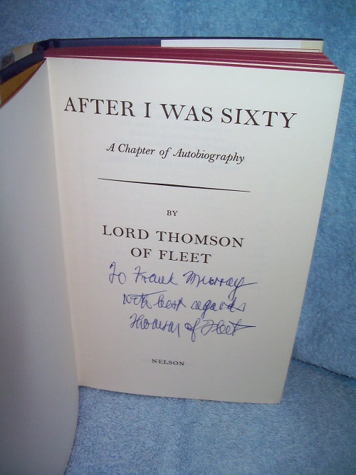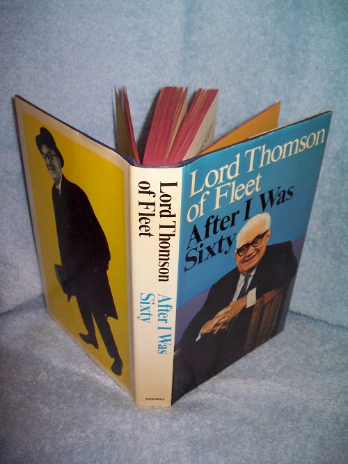 Thomas Nelson & Sons, (Don Mills) Toronto, 1975, believe First Canadian Edition.  ISBN 0-176-05008-6.  Hard cover, 224 pages including Appendix and Index.  Good to very good condition; blue boards with silver lettering on spine; light edge and shelf wear; lower corners and spine ends lightly bumped; crease on spine with a very slight lean.  Red top stain; binding sound.  Dust jacket shows some edge wear, no tears; some light rubs, scratches and impressions; light creases and age-toning.  Interior pages clean and unmarked; mustard end papers; illustrated with black & white photos.  INSCRIBED by Lord Thomson to prior owner "with best regards Thomson of Fleet".  ‘When he first came to Scotland twenty years ago no one had ever heard of Roy Thomson.  Today he owns more newspapers than anyone else in the world.  Though endlessly discussed, dissected, pilloried and profiled, and although already the subject of a full-scale biography which took the story to 1965, Roy Thomson has never told his own version of this extraordinary metamorphosis.  Now he does so with his usual candour.’ (from front flap)  (Roy Herbert Thomson - June 5, 1894 to August 4, 1976).