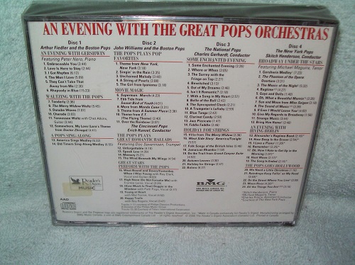 Reader’s Digest Music, Canada, 2000. 4 audio CDs, still in manufacturer’s shrink wrap. Disc 1 – Arthur Fiedler and the Boston Pops; Disc 2 – John Williams and the Boston Pops; Disc 3 – The National Pops Charles Gerhardt, Conductor; Disc 4 – The New York Pops Skitch Henderson, Conductor.