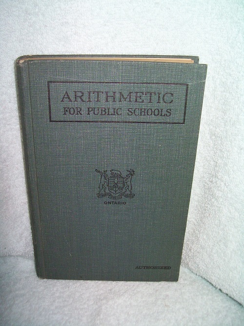 Published by Canadian Watchman Press, Oshawa, 1920, believe a 1933 reprint. Hard cover, 295 pages including answer section. Green cloth over boards with blocked title, Ontario Coat of Arms and lettering in black on front board, black lettering on spine. Corners and spine ends show a bit of wear, a few small spots of soil on front and spine. Binding very good; a few scrapes on top and bottom page edges. Interior pages clean and unmarked with lightly toned pages; no prior owner/school markings, no tears; very gently used. Covers Addition, Subtraction, Division, Multiplication, Numbers, Factors, Divisors, Fractions, Measurements, Percentages, Decimals, Taxes, Duty, Interest, Banking, Commission, Accounts, Interest, Stocks, Square Root, with exercises for each section and answers at the rear.