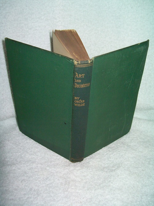 Methuen, London, 1920, appears 1st. Hard cover, 205 pages followed by a list of works by Wilde from the publisher, a specimen page from one of the titles and order form for the 15 volume set offered by the publisher. Green cloth with blind stamped rules, logo, and lettering on front, gilt lettering on spine. Some marks and small stain on boards, corners bumped with some wear, spine ends worn with short tears and tiny losses to cloth; some edge wear. Binding cracked at p. 81 with all pages secure. Gift inscription on FEP; remainder of interior clean and unmarked with tanned pages and occasional age spot. Philosophical lectures and criticism on art, beauty, home decoration, dress and comportment during the Aesthetic period.