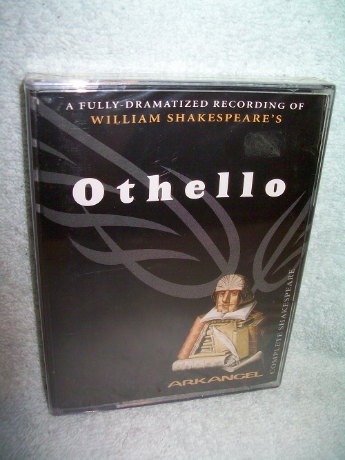 Penguin Audio, 1998, Arkangel Complete Shakespeare. ISBN 014180043-7. 2 audio cassette tapes with an approx. playing time of 2 ½ hours, still in manufacturer’s shrink wrap with original price sticker on rear. Othello is played by Don Warrington, David Threlfall is Iago, Anne-Marie Duff is Desdemona, and Jasper Britton plays Cassio. ‘Othello, a Moorish general in the service of Venice, has married Desdemona, beautiful daughter of a Venetian Senator. But Iago, Othello’s malignant ensign, is determined to destroy their happiness. Cunningly bending the greatness of Othello’s nature to his own purposes, Iago persuades the Moor that Desdemona is unfaithful to him. Tormented in a hell of jelousy (sic), Othello moves inexorably toward the destruction of his innocent wife and himself. This great tragedy confronts the mystery at the heart of evil and contains some of Shakespeare’s most magnificent dramatic verse.’ (from rear case)