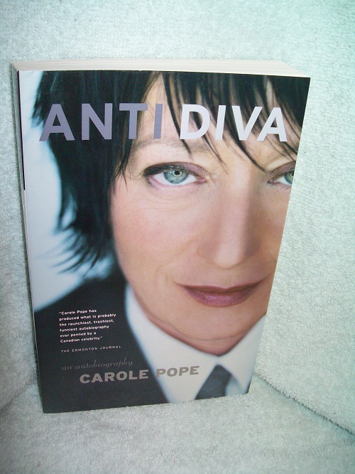 Vintage, Toronto, 2001, 1st pr thus.  ISBN 0-679-31137-8.  Trade soft cover, 254 pages, including Index.  Unread remaindered copy; black & white photo section.  ‘Known for their sexual lyrics and onstage provocations, Carole Pope and her band Rough Trade ushered Canada from the punk movement of the 1970s to the new wave sound of the 1980s, and vaulted themselves into the international music scene.  Now, in Anti Diva, Pope applies her wicked lyrical wit to her own life and offers a no-holds-barred look at her adventures in the music scene – from her love affair with Dusty Springfield to touring with David Bowie; from playing the Womyn’s Festival to singing high opera; from starring with drag queen Divine in the stage play Restless Underwear to seeing Rough Trade’s songs transformed into the spine of a 1999 stage musical.  Throughout her career, Carole Pope has blazed a trail – on the concert stage, in the recording studio, and in the bedroom – for divas and anti-divas everywhere.  And in sharing her thoughts on AIDS, sexuality and sexual politics, and on the new breed of music divas that dominates the charts today, she never hesitates to risk it all.’ (from rear wrap)