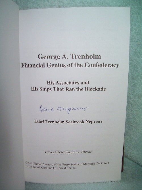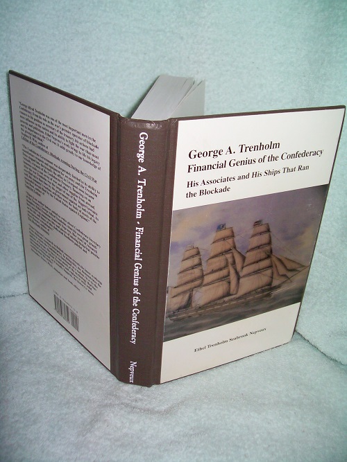 Published by Author, 1999, Printed by The Electric City Printing Company, Anderson, South Carolina, appears 1st. ISBN 0-9668843-1-0. Hard cover, 312 pages including Notes, Bibliography, and Index. Very good; brown boards with paste on front illustration and title, book reviews pasted on rear board. Paste-ons show some rubs and light scratches. Light corner and spine wear, light soil on bottom edge; binding sound although book over-opened at pp. 86/7 resulting in stitching being visible. Author’s signature in blue ball-point ink on title page. Remainder of interior clean and unmarked; black & white photos and illustrations. Full title: George A. Trenholm – Financial Genius of the Confederacy – His Associates and His Ships That Ran the Blockade. Laid in is a double-sided print-out of references concerning the subject, with what is believed to be the author’s handwritten notes along the edges.