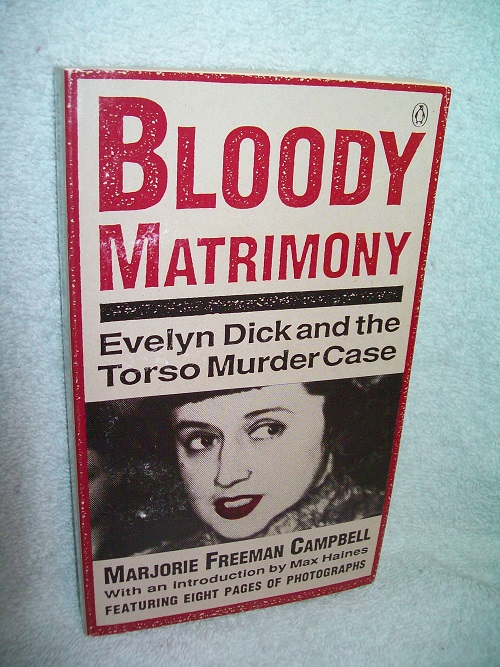 Penguin, Toronto, 1992, reprint of 1974 ‘Torso: The Evelyn Dick Case’.  ISBN 0-14-017187-8.  MMPB. 244 pages including Notes and Afterword.  Unread remaindered copy, tiny corner bends and faint lower rear corner crease, binding very tight; tiny tear at lower rear spine edge; remainder mark on bottom edge.  Interior clean and unmarked with lightly tanned pages; black & white photos.  Introduction by Max Haines.  ‘On March 16, 1946, the headless, limbless body of John Dick was discovered by a group of schoolchildren in the lonely outskirts of Hamilton, Ontario.  So began the most shocking murder investigation ever undertaken in Canadian history.  This is a true-life crime story with all the ingredients of the best detective stories:  lurid sex, seething passion, spine-tingling suspense and gruesome murder.  And it stars a genuine femme fatale, Mrs. Evelyn Dick – a strikingly beautiful woman whose extraordinary sexual proclivities and bizarre testimony shocked the nation.’ (from rear wrap)