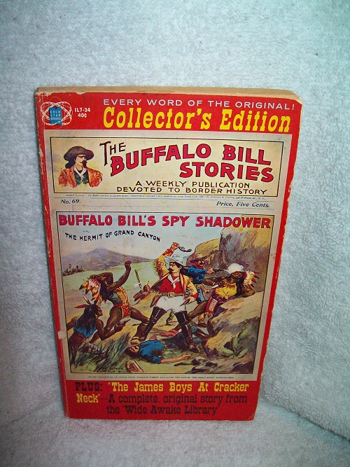 Gold Star, Derby, Conn., no date but circa 1964. Collector’s Edition, IL7-34. Series editor Edward T. LeBlanc. MMPB, 126 pages. Wraps show some edge and cover wear, some colour chipping and light reading creases; binding sound. Old water mark at top margin edge of first few pages; remainder of interior clean and unmarked; pages browning. ‘The Buffalo Bill Stories, a Weekly Publication Devoted to Border History. Collector’s Edition, containing every word of the original! … plus a second complete James Boys story [‘The James Boys at Cracker Neck’] in each volume.’ (from wraps)