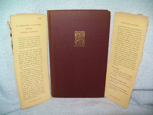 Macmillan Company of Canada, Toronto, 1953, reprint. Hard cover, 207 pages including Appendix. Very good; brown cloth with gilt lettering and illustration on front board, gilt lettering on spine. Boards have a bit of shelf, corner and spine end wear; binding sound. Dust jacket flaps laid in with remainder missing. Gift inscription to their teacher from class 9A dated 1952-53; remainder of interior clean and unmarked with lightly tanned pages; full-page black & white illustrations. Including an account of Canadian Field Sports by Thomas William Magrath; The whole edited by The Rev. Thomas Radcliff; Illustrated by Samuel Lover and Introduced by James John Talman. ‘This, the first of the Pioneer Books (see back flap), was originally published in 1833 … The letters tell the story of the settling of two families in Upper Canada in the 1820’s and early 1830’s, and they tell it with vividness and truthfulness and, above all, with a sense of humour. The Magrath family settled at Erindale, near York (Toronto), in 1827, and the Radcliffs at Adelaide, near London, in 1832. The letters describe the hardships of crossing the Atlantic, the roughness of the roads, the ways of travelling, and the Spartan first days of settlement. Next they turn to a description of Upper Canada as they found it, its people, and its institutions. And a final section is made up of letters by Thomas Wm. Magrath describing the field sports, hunting, shooting and fishing, of those days.’ (from front flap)