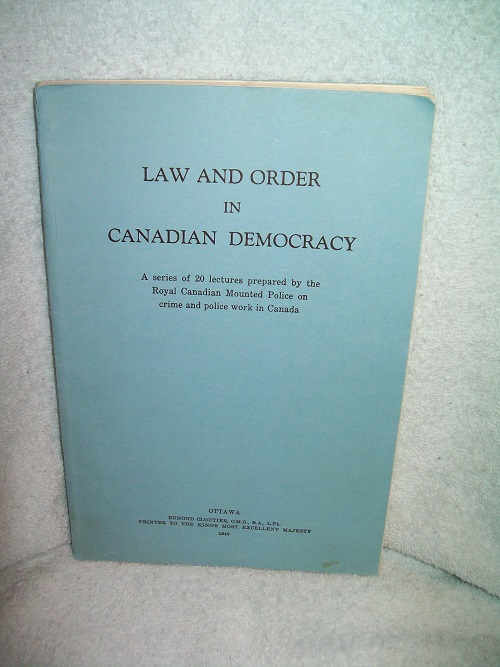 Edmond Cloutier, King’s Printer, Ottawa, 1949. Trade soft cover, 227 pages. Blue card covers with some edge and cover wear, small creases, small light stain at lower front wrap; some scrapes on spine with a neat repair at spine head. Binding sound. Interior clean and unmarked. ‘Law and Order are the companions of Freedom. National discipline, self-imposed, is essential to our democracy. … The maintenance of law and order, the enforcement of our self-imposed discipline, the prevention of crime and the apprehension of criminals, are the functions of police forces. Such forces are thus in principle first and foremost the guardians of democracy. May they never become, like the police of other ideologies, the ministers of tyranny, itself the greatest of crimes.’ (from Foreword)
