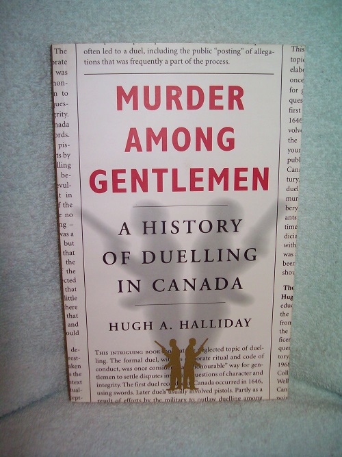 Robin Brass Studio, Toronto, 1999.  ISBN 1-896941-09-5.  Trade soft cover, 199 pages including Appendix, End Notes, Bibliography, and Index.  Very good; light crease on spine, small corner bends; binding tight.  Interior clean and unmarked; black & white photos and illustrations.  ‘… not only describes some of the most interesting duels that took place in Canada but looks at duelling in light of our human tendency to ritualize conflicts with codes of acceptable and unacceptable practice.  He also examines the steps that often led to a duel, including the public “posting” of allegations, or insults, that was frequently a part of the process.’ (from rear wrap)