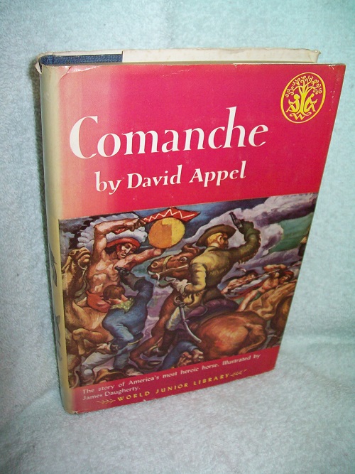 World, Cleveland, 1951.  Hard cover, 224 pages.  Very good; blue cloth with embossed front, gilt lettering and decorations on spine.  Binding sound, light corner and spine end wear.  Dust jacket price-clipped, some edge and cover wear, short edge tears and tiny losses; spine sunned; bit of soil.  Book interior clean and unmarked with tanned pages.  Black & white illustrations by James Daugherty.  “From Custer’s Battle of the Little Big Horn, fought to the bloody climax known as Custer’s Last Stand, there emerged one lone, badly wounded survivor:  the ugly duckling army horse Comanche.  Told by himself, this is Comanche’s true story – the story of a man and a horse, a tale of drama and high courage in the West and on the battlefield.” (from front flap)