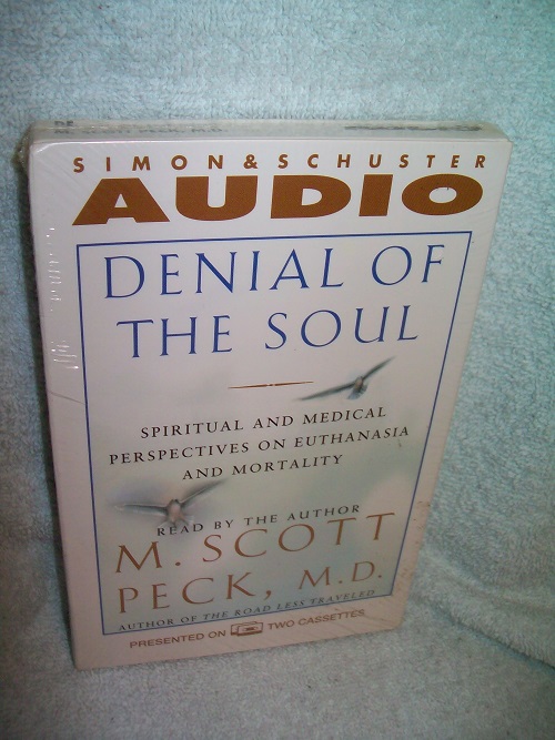Simon & Schuster Audio, New York, 1997. ISBN 0-671-57648-8. 2 cassette tapes with approx. playing time of 3 hours, still in manufacturer’s shrink wrap, film cut away over bar code on rear. Read by the author. ‘… Dr. Peck helps us face the reality of doing “the work of dying” and coming to terms with our own and our loved ones’ mortality. Through a profound exploration of one of the most explosive issues of our age – euthanasia and the right to die – Dr. Peck poses the questions we should all ask ourselves and helps us determine the spiritual lessons that dying is meant to teach us. Through compelling stories from Dr. Peck’s own experiences as a physician, he explores core issues that should arise when people face the question of euthanasia for themselves, their loved ones, or society. A deeply moving meditation on what euthanasia reveals about the status of the soul in our age, Denial of the Soul is a masterwork of grace and scholarship, of meaning and medicine, and of compassion and honesty.’ (from rear box)