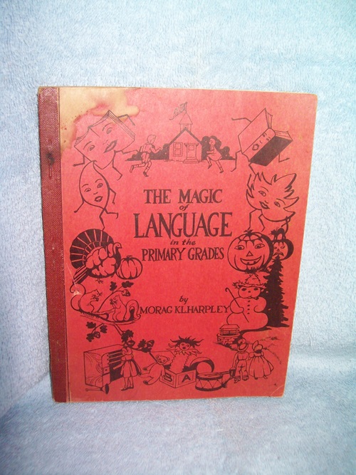 School Aids and Text Book Publishing Co., Limited, Regina and Toronto, No Date.  Trade size soft cover, 162 pages.  Illustrated red card covers with black lettering and illustrations on front, black illustrations on rear and black lettering on red cloth spine.  Some edge and cover wear, water mark at upper left corner; binding sound.  Except for water mark on each page in upper margin, interior is clean and unmarked; a bit of age spotting on outer page block; a few red/pink transfers from card covers.  ‘The growth of language is a gradual process, from the effort of the infant to express himself to the skill of the writer or orator who can influence vast numbers of people by his use of words.  It is with this in mind that this book has been prepared – to assist in the development, over a period of time, of the child’s desire and ability to express himself effectively, orally and in writing.’ (from Foreword)