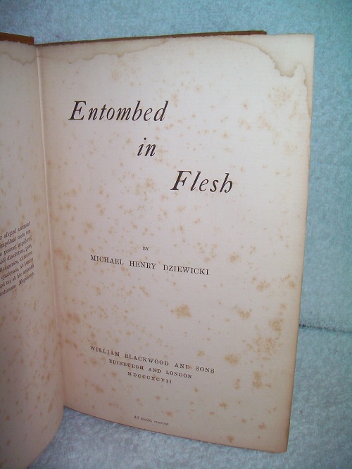 William Blackwood and Sons, Edinburgh and London, 1897, First Edition. Hard cover, 282 pages plus 2 pages of ads. Orange cloth with lettering in black on front board and spine; decorative blind stamp on front encasing title and author. Boards show cover and edge wear with some fraying, some stains and soil; spine darkened with short tears at ends and small loss at spine bottom; front and rear hinges cracked with all pages secure. Front end-paper removed; old water mark along top edges and upper fore-edges to page 64. Some fox spots in text, but most heavily to few first and last pages; splash mark on p. 77 affecting a few pages but all text remains very readable; edge tear at bottom margin of p. 229; three small 2-3 mm holes at upper fore-edge; dried mildew in gutters by stitching of some pages. Fantasy novel in which Phantastos, a spirit who sided neither with God nor Lucifer in order to be free to roam the universe, accepts a challenge from Lucifer to inhabit the body of an earth man and defend a young woman from Lucifer’s attacks to cause her to sin. If Lucifer wins, the woman’s soul is forfeit, and Phantastos will be enslaved to him.