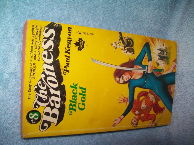 Pocket, Markham, ON, 1975, 1st/2nd pr. ISBN 0-671-77962-1. MMPB, 217 pages followed by 1 page of ads. Wraps show edge and cover wear with some rubs and creases, age toning/spots, reading creases on spine and along front spine edge; outer page block tinted red with number stamped on bottom edge; binding sound with a bit of a lean. Interior clean and unmarked with tanned pages. Cover art by Hector Garrido. ‘Baroness Penelope St. John-Orsini takes on SPOILER, a mysterious organization that threatens to turn the world’s most precious commodity into an all-devouring instrument of death. Now the sensuous superspy must use every inch of her devastating body against a perverted mastermind who dreams of global conquest. Facing sadists and sea monsters, she hasn’t a moment to lose – for already the lethal lubricant has begun to choke the planet in a horrible ooze of black death!’ (from rear wrap)