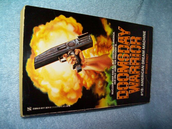 Zebra, New York, July 1990, 1st pr. ISBN 0-8217-3074-6. MMPB, 190 pages. Wraps show some edge and cover wear, creases and reading creases; binding sound. Book store stamp on blurb page; remainder of interior clean and unmarked. ‘America struggles to survive after a devastating first strike nuclear attack by the Russians. A virtual slave colony at the mercy of the brutal Soviet occupation army, the United States has one chance to regain her freedom: Ted Rockson, the Doomsday Warrior, and his underground high-tech guerilla army of Free Fighters! But a bloody sneak attack scatters the rebels and gets Rockson captured. Stripped of his weapons, weakened by hunger, the Doomsday Warrior is forced to endure wave after wave of searing pain as a prisoner of the deadly Soviet torture device known only as the Dream Machine. Rockson must survive long enough for his men to rally to his rescue…the future of America depends on it!’ (from rear wrap)
