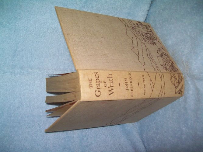 Viking, New York, June 1939, 7th pr. (believe BCE). Hard cover, 619 pages. Brown wrap-around illustration on oatmeal-coloured boards; a bit of lower edge wear; some of corner wear with a bit of fraying at upper points; touch of soil and age-toning on boards. No jacket. Battle Hymn paste downs and endpapers with off-setting; binding cracked at verso of rear endpaper, all pages secure. Bit of soil on outer page block. Interior clean and unmarked with tanning pages. The story of the Joad family during the Great Depression, travelling from Oklahoma to California in search of a better life.