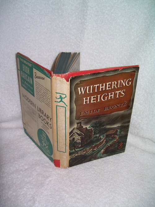 Modern Library, New York, no date. Hard cover, 390 pages plus 7 pages of ads. Red cloth with gilt frame and logo on front board, gilt lettering on green patch; gilt logo and gilt lettering on green patch on spine. Some corner and spine end wear; binding sound; green top-stain. Dust jacket with price intact has edge and cover wear, short tears and small losses; spine sunned; general age-toning; list of 291 books available on inside jacket. Book interior clean and unmarked with tanned pages. ‘Emily Bronte’s brooding imagination evoked as thwarted and tragic a group of human creatures as ever walked the bleak moorlands or had their existence in the dark byways of life. The barren world in which their villanies flourished forms the background for deeds as weird as they are sinister and for passions as fierce as they are persistent. Wuthering Heights is by common consent one of the most compelling novels in the English language. It is a book compact of beauty and loveliness, hate and cruelty and heartrending pathos.’ (from front flap)