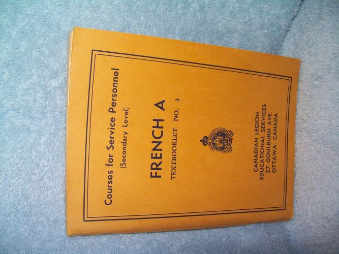 Canadian Legion Educational Services, Ottawa, 1941.  Soft cover, 175 pages.  Stapled wraps show a bit of spine end wear; binding sound.  Interior clean and unmarked with tanning pages.  French course for Service personnel includes short prose in French with accompanying vocabulary, grammar and exercises to complete.