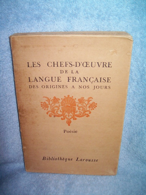 Bibliotheque Larousse, Paris, 1924. Trade size soft cover, 240 pages plus ads. Paper covered card wraps show edge and cover wear, some creases, age toning, small marks; short tears at spine ends, reading creases. Price label on FEP, Larousse book mark laid in; pages tanned with occasional markings; majority of pages unopened; some soil on outer page block. Masterpieces of the French language in poetry and prose.