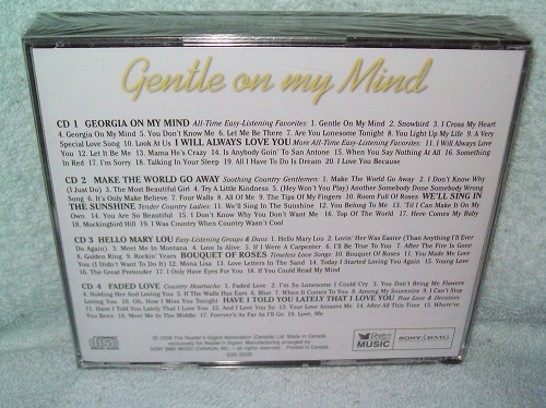 Reader’s Digest Music, Canada, 2006. 4 audio CDs, still in manufacturer’s shrink wrap. Disc 1 – Georgia On My Mind/All-Time Easy-Listening Favorites, I Will Always Love You/More All-Time Easy-Listening Favorites; Disc 2 – Make the World Go Away/Soothing Country Gentlemen, We’ll Sing In The Sunshine/Tender Country Ladies; Disc 3 – Hello Mary Lou/Easy-Listening Groups & Duos, Bouquet of Roses/Timeless Love Songs; Disc 4 – Faded Love/Country Heartache, Have I Told You Lately That I Love You/True Love & Devotion. 75 songs.