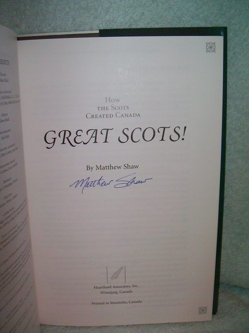 Heartland Associates, Winnipeg, Manitoba, 2003, 1st. ISBN 1-896150-44-6. Hard cover, 224 pages. Very good plus; binding sound with headbands, spine ends lightly pushed, upper corners lightly bumped. Dust jacket with price intact shows very light rubs; some light scratches and impressions. Interior pages are clean and unmarked, white and bright; colour and black & white illustrations. FLAT SIGNED by author on title page. ‘Through the fur trade, Scots formed the backbone of North America’s first continent-wide industry more than two hundred years ago. They then used their power to create the first banks, railways, shipping lines, universities, and media. They also branched into and dominated politics, the military and literature. This book demonstrates the astounding extent to which Canada’s fundamental institutions and culture are a product of early, tough-minded Scottish immigrants.’ (from front flap)