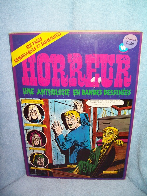 Williams France, Paris, 1974, 1st. Large soft cover, 128 pages. Good plus; some edge and cover wear; small score on front wrap near spine; sticker and sticker residue on front wrap. Interior clean and unmarked; mostly colour with some black & white illustrations; glued binding. Text in French. Collection of horror stories from comics from years gone by.