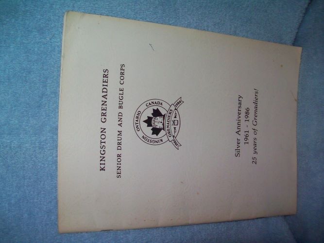 Kingston Grenadiers, Kingston, ON, 1986. Large stapled soft cover, unpaginated. Wraps show some edge wear and creases, small stains and marks, small puncture at top right corner. Interior clean and unmarked; black & white photos. ‘Since their inception, the Grenadiers have been Kingston’s unofficial marching ambassadors in and around the drum corps and parade circuits, performing in many communities in Ontario, Quebec, New York, Pennsylvania, Rhode Island, Maryland and Massachusetts.’ (from first page)