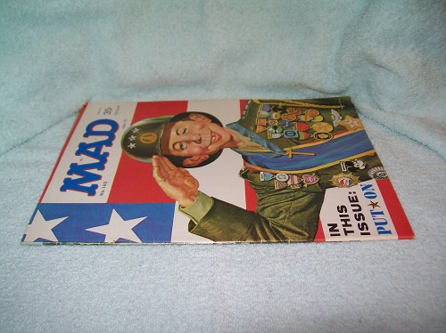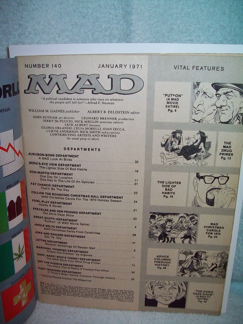 E. C. Publications, New York, 1970. Fine; lays flat, bit of age toning; very light stress marks. Rear cover fold-in folded resulting in one very faint vertical crease. Interior clean and unmarked, no rust on staples; 48 lightly tanned pages. Features: “Put*On” (A MAD Movie Satire), The MAD Drug Primer, The Lighter Side of Bad Habits, MAD Christmas Carols, Advice Columns Through History, “The Doris Daze Show” (A MAD TV Satire), and more.