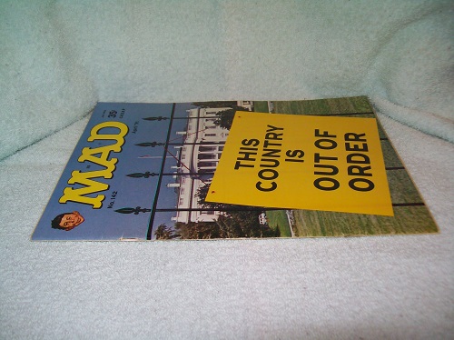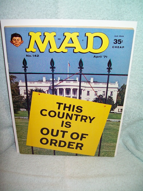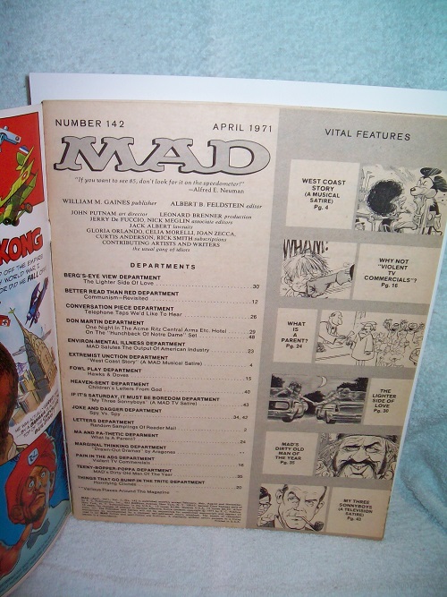 E. C. Publications, New York, 1971. Good+; lays flat, bit of age toning; very light stress marks; cover detached at lower staple. Very faint vertical crease on rear cover. Interior clean and unmarked, no rust on staples; center page detached but present; 48 lightly tanned pages. Features: West Coast Story (A Musical Satire), Why Not “Violent TV Commercials”?, What is a Parent?, The Lighter Side of Love, MAD’s Dirty Old Man of the Year, My Three Sonnyboys (A Television Satire), and more.