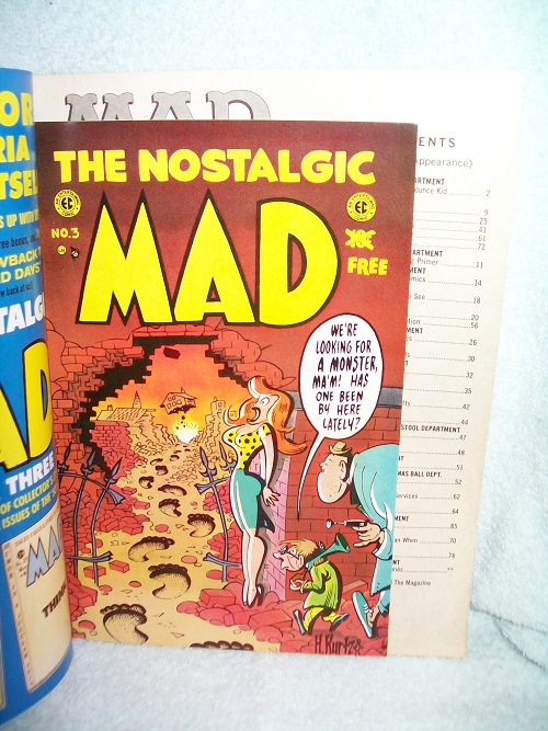 E. C. Publications, New York, 1970, 1971, 1974. Very Fine+; touch of edge wear, binding sound. Rear fold-in NOT folded. Interior clean and unmarked; 80 tanned pages; includes insert of The Nostalgic MAD No. 3 comic still bound in. Collection of various items from MAD Magazines of 1970, 1971, and 1974, plus The Nostalgic MAD No. 3 comic insert.
