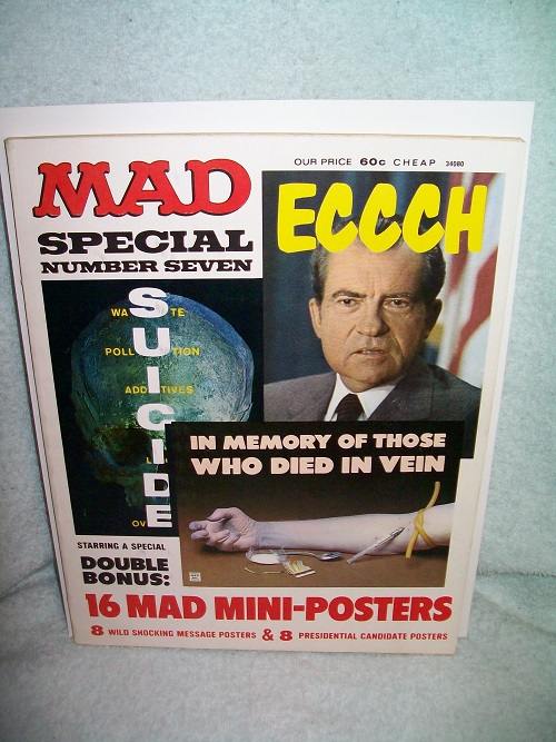 E. C. Publications, New York, 1967, 1968, 1969, 1972. Fine; light reading crease along front spine edge, some stress marks, bit of age toning and discolouration in white spaces, very small lower corner creases; binding sound. Rear fold-in NOT folded. Interior clean and unmarked; 80 tanned pages; includes insert still bound in. Collection of various items from MAD Magazines of 1967, 1968, 1969, and 1972, plus 16 Full-Color MAD Mini-Posters insert.