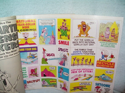 E. C. Publications, New York, 1968, 1969, 1973. Very Fine-; light edge and cover wear, bit of age toning and discolouration to white areas; binding sound. Rear fold-in NOT folded. Interior clean and unmarked; 80 lightly tanned pages; includes insert still bound in with all stickers present. Collection of various items from MAD Magazines of 1968, 1969, and 1973, plus Full-Color Fold-Out Don Martin Nonsense Stickers.