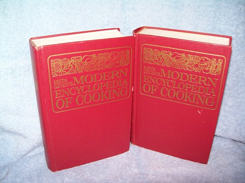 J. G. Ferguson, Chicago, 1969. Hard covers; Vol. 1 – pages 1 to 736, Vol. 2 – pages 737 to 1553. Red boards with gilt lettering and decorations on front and spine. Some edge and corner wear, scrape on each front board and small soil spot on front of Vol. 1; spine ends bumped with wear and short tears. Binding sound, with Vol. 1 just a bit loose, and all pages secure. Bit of soil on last page of Vol. 1 and small burn mark in rear gutter of Vol. 2; no other flaws noted. Illustrated with black & white and colour plates and black & white illustrations. ‘In taking this book into your kitchen, you are bringing to your aid in meal-planning, cooking, serving, and even cleaning up, the wise and friendly counsel of Meta Given herself. In it, she presents “cooking” in its modern sense – as a science and an art.’ (from foreword)