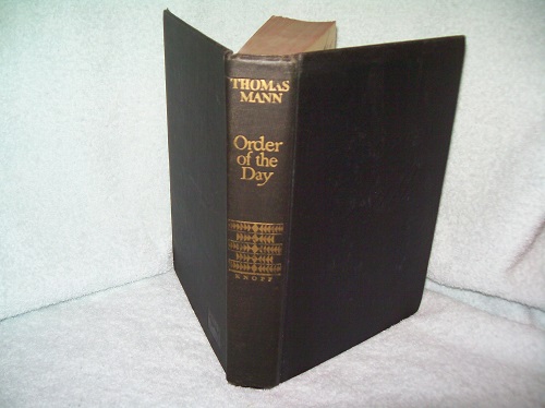 Alfred A. Knopf, New York, 1942, First US Edition. Hard cover, 280 pages followed by a list of Principal Works of Thomas Mann (First Editions in German) and list of American Editions in Translation. Very good; black cloth with embossed title and initials on front board, gilt lettering and decoration on spine. Boards show some edge, corner and spine end wear; some old moisture marks; binding sound with a slight lean, faded red top stain. No jacket. Prior owner’s info on front and rear paste-downs and name inked on FEP; remainder of interior clean and unmarked. Translations from the German by H. T. Lowe-Porter, Agnes E. Meyer, and Eric Sutton. Political Essays and Speeches of Two Decades leading up to World War II, written mainly for the people of Germany.