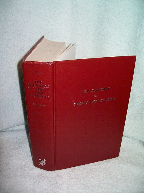 Chemical Publishing Company, New York, 1971, Third Edition, First American Edition. Hard cover, 727 pages including Appendices, Name Index, and Subject Index. Very good minus; red boards with silver lettering on front and spine; some spine end wear with a bit of wrinkling and creasing on spine, light wear to lower corners. Binding sound with headbands. Prior owner’s address label on front paste-down and embossed name seal on half-title page; gift/recognition inscription on FEP; bit of soil at bottom fore-edge page block, small age/soil spots in fore-edge margins of a few pages; remainder of interior clean and unmarked. Illustrated with black & white photos, line drawings, tables and graphs. ‘The purpose of the book is to deal with the chemical and physical properties of cements and concretes and their relation to the practical problems that arise in manufacture and use. As such it is addressed not only to the chemist and those concerned with the science and technology of silicate materials, but also to those interested in the use of concrete in building and civil engineering construction.’ (from Preface)