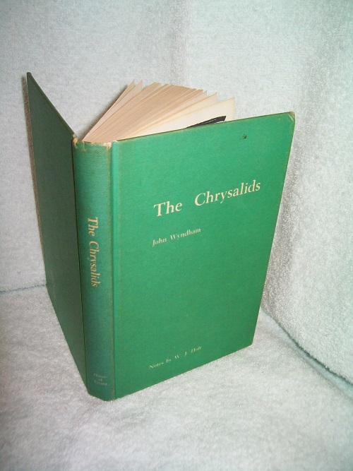 House of Grant, Canada, 1965.  Hard cover, 225 pages including Glossary and Questions for each chapter.  Very good; green cloth with white lettering on front and spine, white decoration on rear; a bit of soil on covers.  Some corner and spine end wear, light edge wear.  Binding sound.  Black marker over two stamped lines on FEP; remainder of interior clean and unmarked.  Black & white illustrations by Peter Edwards.  Post-apocalyptic novel set in the future, where society does not accept or tolerate any mutations.  The narrator, David, befriends Sophie, who has six toes.  David later discovers that he has telepathic abilities, communicates with others who have the same ability, and begins to question the community’s strict fundamentalist rules.