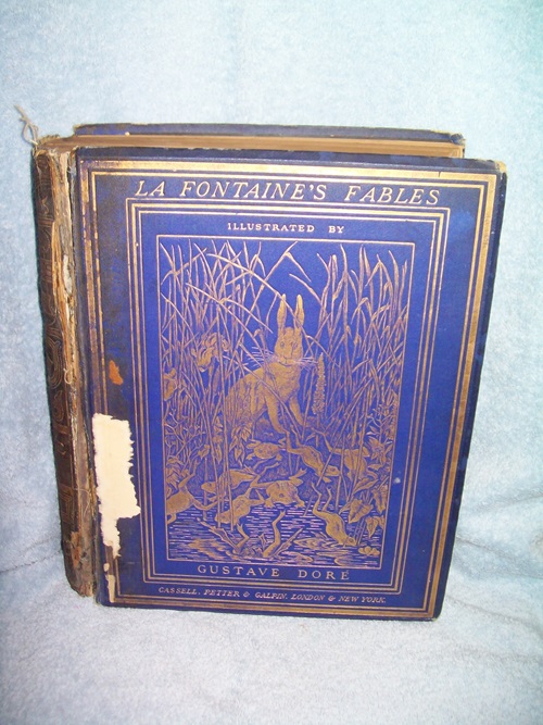 Cassell, Petter & Galpin, London Paris & New York, no date. Translated into English Verse by Walter Thornbury and illustrations by Gustave Dore. Very large heavy hard cover, 839 pages follow by 4 pages of ads. Blue cloth over boards with gilt lettering and illustrations on front and spine. Front board detached with sections of cloth missing, corners worn to boards; spine worn and darkened with several repairs and some pieces of cloth missing. Rear board has been taped in and still holding but is weak. Dark blue end-papers and paste-downs; frontis of La Fontaine with tissue guard laid in; all edges gilt. Pages and illustrations are all present. Small drop in margins of pp. 335 and 381; occasional age spot; pages lightly tanned. Includes An Essay on the Life and Works of Jean de La Fontaine; The Life of Aesop, The Phrygian; Dedication to Monseigneur the Dauphin; Preface; To Monseigneur the Dauphin; 241 fables, and 86 full page illustrations by Dore. John George Hodgins (1821-1912) was a Canadian author and Deputy Minister of Education for Ontario. Aside from various honours and awards received, he was considered instrumental in perfecting the Ontario school system at that time.