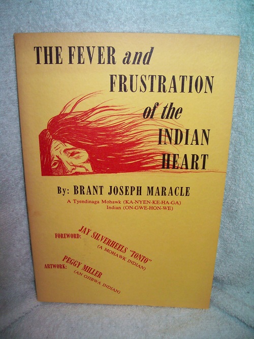 Maracle Press, Oshawa, 1972, believe first. Trade soft cover, 51 pages. Very good; yellow illustrated card covers with red and black lettering on front and rear. Very light edge wear, binding sound, a bit of age toning. Interior clean and unmarked with white pages; black & white illustrations. INSCRIBED, SIGNED AND DATED at bottom of Author’s Preface. Foreword by Jay Silverheels “Tonto” (A Mohawk Indian); artwork by Peggy Miller (An Ojibwa Indian). ‘This collection of poems, prose and verse is offered to you. I trust that your heart will sense the fever, frustration and pathos that grips the Native heart! Please note, where the term Indian is used it is, unfortunately, only because that is the term by which the general public recognize us. The term Indian represents to we Natives a nickname or a misnomer given to us by Columbus! My life has been intimately involved in the political struggles of our Native People. From the occupation of the Federal building of Indian Affairs in Washington, D.C. to Native People’s Embassy in Ottawa, my ear has been to the earth, hearing the cry of the “grass roots Native People.” Some of these writings are the outgrowth.’ (from Author’s Preface)
