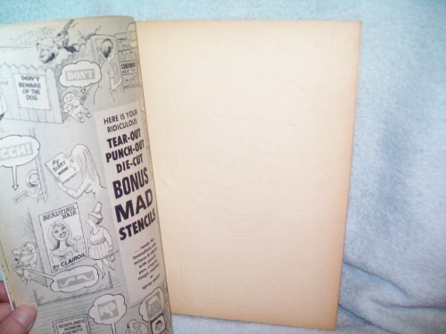 E. C. Publications, New York, 1964, 1965, 1967. Fine+; some age toning/foxing and cover wear, reading crease along front spine edge, some stress marks, light creases at lower rear corner; binding sound. Rear fold-in NOT folded. Interior clean and unmarked; 80 tanned pages; includes insert of MAD Stencils still bound in and un-punched. Collection of various items from MAD Magazines of 1964, 1965, and 1967, plus Die-Cut, Punch-Out MAD Stencils.