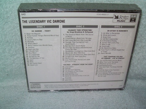 Reader’s Digest Music, Canada, 1998. 3 audio CDs still in manufacturer’s shrink wrap. Disc 1 – Vic Damone … Today!; Disc 2 – Younger Than Springtime/Vic Sings Broadway & Hollywood, Feelings … Straight From The Heart; Disc 3 – An Affair To Remember, That Towering Feeling! Vic Damone … Live in Concert.