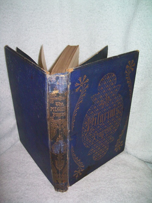 Cassell, Petter, and Galpin, London, no date but 19th century.  Hard cover, 399 pages plus ads.  Fair; blue cloth with gilt lettering and design on front and spine; boards rubbed with some stains; heavy edge, corner and spine end wear.  Repairs to spine, tape residue on front board across spine with mid to bottom front board detached from spine; binding weak.  All edges gilt; dark blue end papers.  Prior owner’s name at top of title page; frontis of Bunyan; illustrated.  Ad section at rear barely attached at gutter and appears an attempted repair was made.  Interior pages unmarked; scattered foxing throughout but all text very legible.  ‘The entire book is presented as a dream sequence narrated by an omniscient narrator.  The allegory’s protagonist, Christian, is an everyman character and the plot centres on his journey from his hometown, the “City of Destruction” (“this world”), to the “Celestial City” (“that which is to come”:  Heaven) atop Mount Zion.  Christian is weighed down by a great burden – the knowledge of his sin – which he believed came from his reading “the book in his hand” (the Bible).  This burden, which would cause him to sink into Hell, is so unbearable that Christian must seek deliverance.  He meets Evangelist as he is walking out in the fields, who directs him to the “Wicket Gate” for deliverance.’ (from Wikipedia)