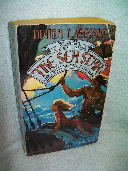 Tor, New York, 1988, 1st/1st.  ISBN 0-812-54864-7.  Former library book.  MMPB, 374 pages including Afterword.  Good; wraps show edge and cover wear, creases and reading creases, library sticker at lower spine; binding sound.  Library pocket affixed to verso of front wrap, FEP removed; stamp on one interior page and on rear end paper; remainder of interior clean and unmarked with lightly tanned pages; small paint mark at lower rear page block, small dot on top edge.  ‘Julian, the long-lost son of Queen Faris and King Jehan, has returned to heal the kingdom of Westria.  But he cannot prove his heritage and gain the throne except by searching out and mastering one by one the four great Jewels of Power lost in the magical cataclysm that destroyed his parents years ago.  And Caolin, the jealous Blood Lord, the Sorcerer who was the author of the great destruction, still lives. The Jewels alone stand between him and utter ark power, from which Westria will never recover.  Caolin’s lust for Julian’s death knows no bounds.  And The Sea Star lies hidden, waiting to be found, to be mastered, for good or evil.’ (from rear wrap)