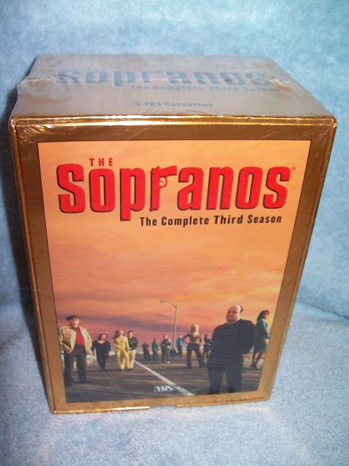 HBO Home Video, 2002, VHS video tape box set, NTSC, Closed Captioned, Colour, Drama. 13 episodes on 5 cassettes. New in shrink wrap. 780 minutes approx. playing time. Starring James Gandolfini, Lorraine Bracco, Edie Falco, Steven Van Zandt, Michael Imperioli, Dominic Chianese, Vincent Pastore, Tony Sirico, Robert Iler, Jamie-Lynn Sigler, and Nancy Marchand. ‘The story of season three focuses on the relationship between Tony and his children — Meadow, as she begins her first year at Columbia University, and Anthony Jr., who is having behavioral troubles in high school. Tony's relationship with his aging mother, Livia, is brought to a head. Dr. Melfi experiences a horrifying personal trauma, but begins to make real progress in discovering the root causes of Tony's panic attacks. Also featured heavily are Christopher's rise in the mob when he becomes a made man, and Tony's extramarital affair with another one of Dr. Melfi's patients, Gloria.’ (from Wikipedia)
