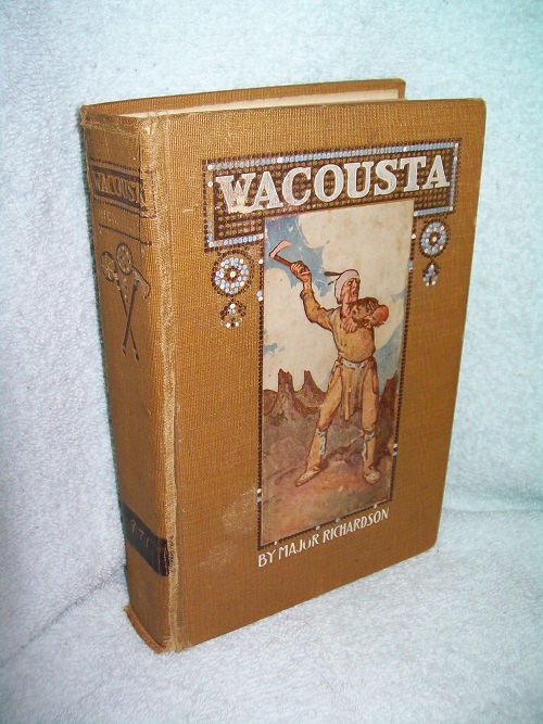 Historical Publishing, Toronto, 1906, spine stamped Briggs as publisher.  Hard cover, 454 pages.  Acceptable; former library book with stamps to interior and number on black stripe on spine.  Brown cloth with colour paste-on illustration and embossed colour decorations; wear to all edges with some fraying and board exposed, some stains and soil; age spotting on outer page block.  Illustrated end papers with front and rear hinges split, text block secure to spine.  Sepia frontis with tissue guard intact and all other illustrations by C. W. Jefferys present.  Pages clean and unmarked, pages lightly tanned with occasional age spot.  Historical fictional account of Pontiac’s attempts to overtake the last two British forts in 1763.