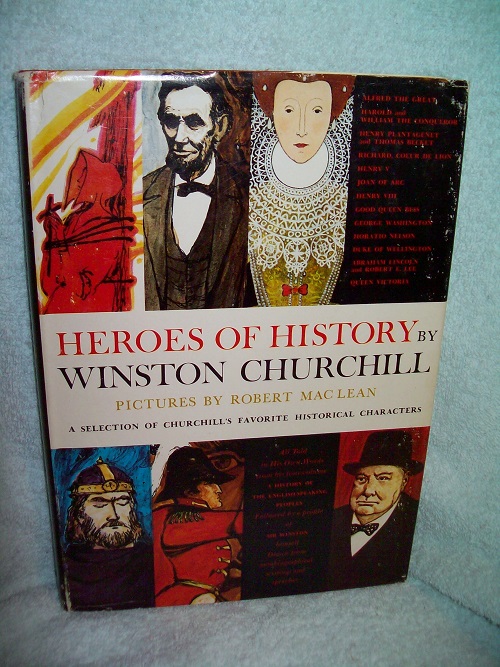 McClelland and Stewart, Toronto, 1968. Hard cover, 192 pages including Index. Very good; red cloth with embossed lion on front board, gilt lettering on spine. Light edge, corner and spine end wear; binding sound with headbands. Price-clipped dust jacket shows edge and cover wear, some edge tears, wear at corners and spine ends, some creases. Book interior clean and unmarked; colour illustrations by Robert MacLean. Includes Alfred the Great, King Harold, William the Conqueror, Henry Plantagenet, Thomas Becket, Richard – Coeur de Lion, Henry V, Joan of Arc, Henry VIII, Good Queen Bess, George Washington, Horatio Nelson, Duke of Wellington, Abraham Lincoln, Robert E. Lee, Queen Victoria. ‘And because these are his favourite heroes (and heroines) he writes about them with particular warmth and understanding. He brings us not only the life story of each individual, but the whole rich sweep of history. Also included is a profile of Churchill himself, compiled from his speeches and memoirs.’ (from flaps)