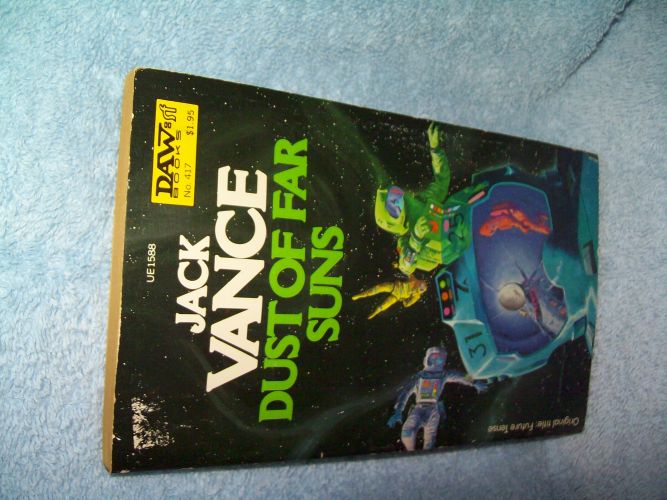 DAW, New York, 1981, 1st pr thus. ISBN 0-87997-588-1. DAW’s SF Books No. 417. MMPB, 160 pages. Wraps show light edge and cover wear, colour loss from sticker removal at upper left; binding tight with very faint reading creases; old price sticker on rear wrap. Interior clean and unmarked with tanning pages; black & white frontis; slight bow to book. Includes: Dust of Far Suns, Dodkin’s Job, Ullward’s Retreat, and The Gift of Gab. ‘Here are four novelettes, each displaying in delectable detail all the qualities that mark Vance’s great novels. Alien societies, exotic peoples, far worlds, and the vast communion between the stars, are all here.’ (from rear wrap)