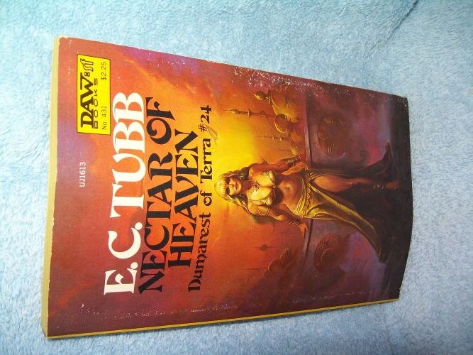 DAW, New York, 1981, 2nd pr.  ISBN 0-87997-613-6.  DAW’s SF Books No. 431.  MMPB, 160 pages.  Wraps show light edged wear, some colour transfer on front wrap, binding tight.  Interior clean and unmarked with tanning pages, a few age spots on top page block; bit of a bow to book.  ‘The planet had two unique elements.  One was that it produced the galaxy’s most elusive and most desirable hallucinatory drug.  The other was that it was a stock brokers’ paradise.  The world was split into rich men’s holdings and every day, every hour, every minute, these were being traded on a continuous stock market. …  Their money game controlled everything else – the common people, workers, farmers, homes, lives, women, poverty and luxury – all were at the continuous sway of that market of gluttony.  Earl Dumarest went there to find his next stake.  Find the drug-gem or manipulate the market – two possibilities.  But behind the scenes stood the advisors of the inhuman Cyclan determined to fix the odds against Dumarest….’ (from rear wrap)