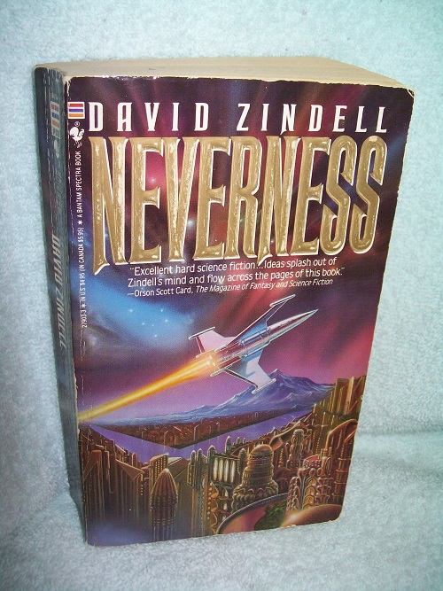 Bantam, New York, 1989, 1st pr thus.  ISBN 0-553-27903-3.  MMPB, 552 pages.  Good reading copy; wraps show edge and cover wear, small corner bends; reading creases on and along spine, scrapes along spine edges; binding sound with a slight lean.  Number stamped on top edge, small stain on first page; remainder of interior clean and unmarked, pages quite tanned.  ‘The world of Neverness is … filled with extraordinary beings: the Alaloi, whose genes have “backmutated” … the Order of Pilots, which reworks the laws of time and physics … the Solid State Entity, a nebula-size brain composed of moon-size biocomputers; and the Ieldra, a mythical race of aliens that eons ago seeded the galaxy with its DNA … Against this backdrop is told the story of Mallory Ringess, a headstrong novitiate of the Order of Pilots.  Against all odds, he has navigated a maze of interspatial passageways to penetrate the Solid State Entity.  Now he returns to his native Neverness with a stunning discovery …’ (from rear wrap)