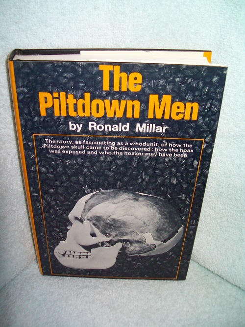 St. Martin’s, New York, 1972, 1st thus.  Hard cover, 264 pages including Appendices, Select Bibliography, and Index.  Very good plus; tight binding with a very slight lean; dust jacket with price intact shows a few light scratches.  Book interior clean and unmarked; black & white photos and illustrations.  ‘Piltdown has become a notorious name in archaeology.  This was the place where, in 1912, a respected amateur archaeologist, Charles Dawson, discovered the skull of a creature thought to be the long sought for and long argued about “missing link”. … it was accepted by scholars everywhere.  And then, in 1953, modern research established that the skull was a hoax, the spurious amalgam of fragments of a fairly recent skull and what was believed to be the jaw of a female orang-utan.’ (from front flap)