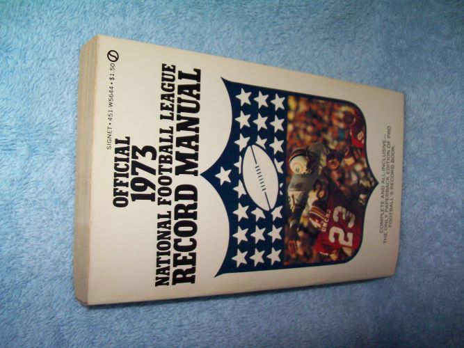 Signet, New York, August 1973, 1st pr.  W5644.  MMPB, 368 pages including 3 blank pages for Notes.  Unread copy, bit of age-toning; binding tight.  Interior clean and unmarked with lightly tanned pages.  ‘Officially authorized by the National Football League, it is a many-splendored word and statistics feast for the fan.  Here are the records of the stars of yesterday and today.  Here are the achievements of all the teams, old and new.  Here are the scores of the play-off games and Super Bowl contests, plus the official NFL Schedule for 1973.  Here in one complete volume are the dramatic history and exciting lore of pro football.’ (from rear wrap)